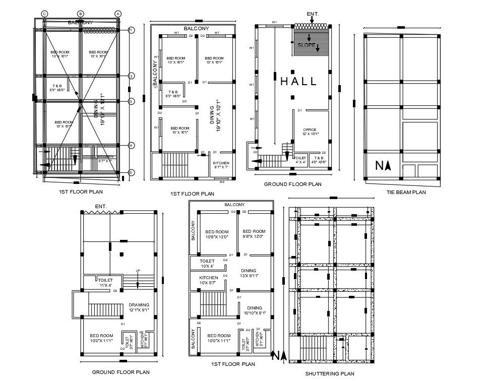 Ther architecture AutoCAD drawing of the ground floor and first-floor plan that shows 4 BHK and 3 BHK with shop and offices. download house project plan AutoCAD file.