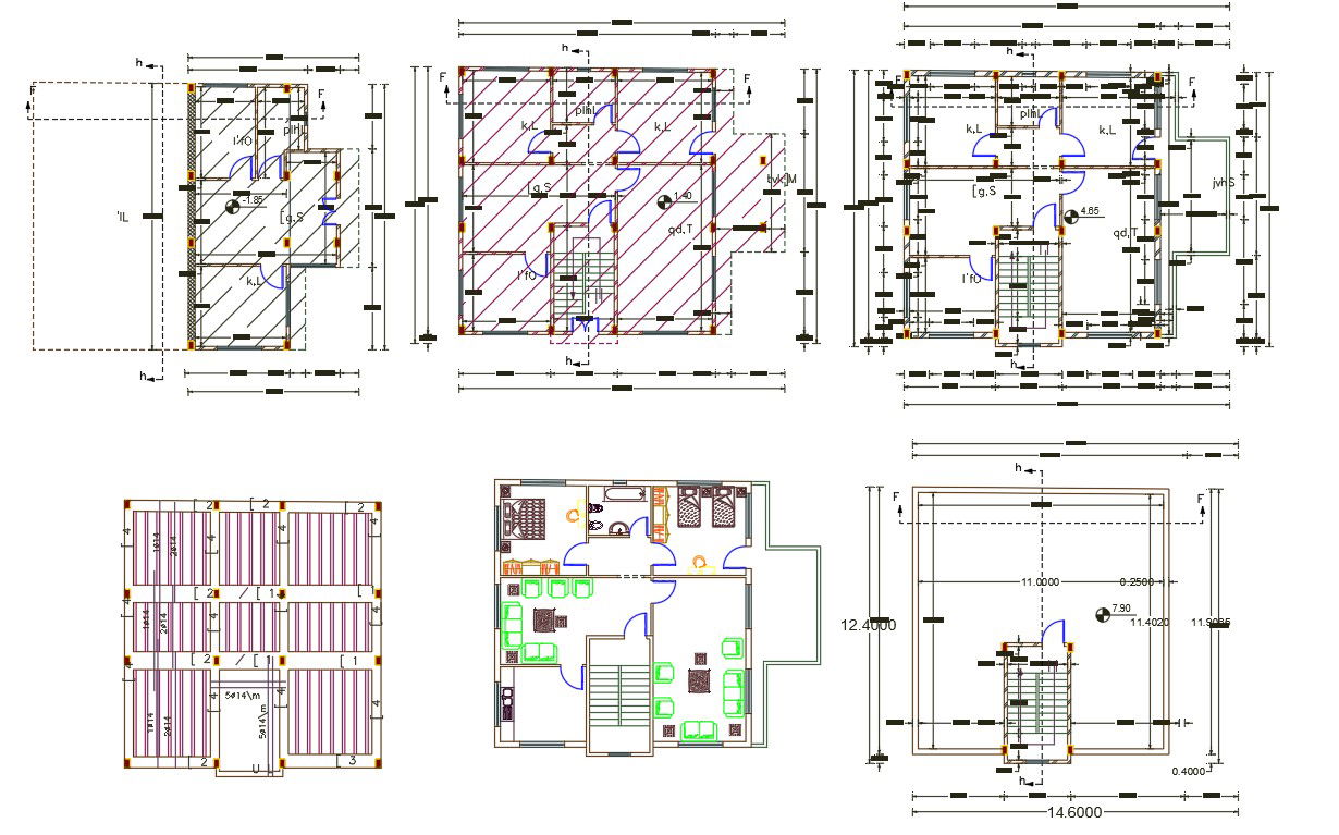 2d CAD drawing of residence house 3 storey house furniture layout plan design includes 2 bedrooms, drawing room, living area, and kitchen. download house plan with slab bar structure design DWG file.