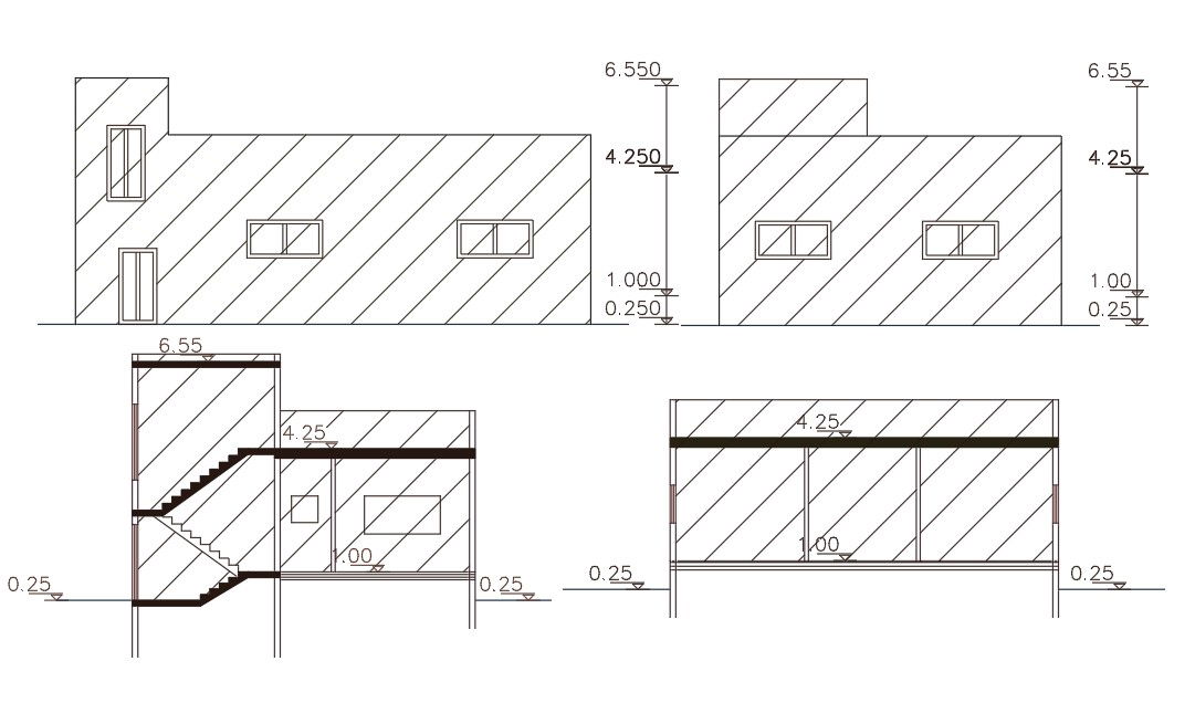This is 2 BHK single storey house building design that shows front and side view section drawing and elevation design with door window marking detail.