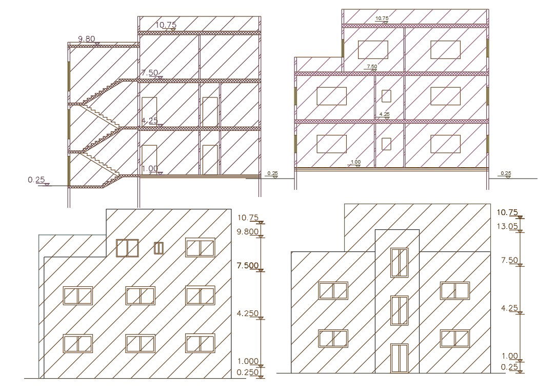 200 square meter plot size of multifamily house building sectional elevation design that shows front and side side view with floor level building structure design. download 3 BHK house building design AutoCAD file.