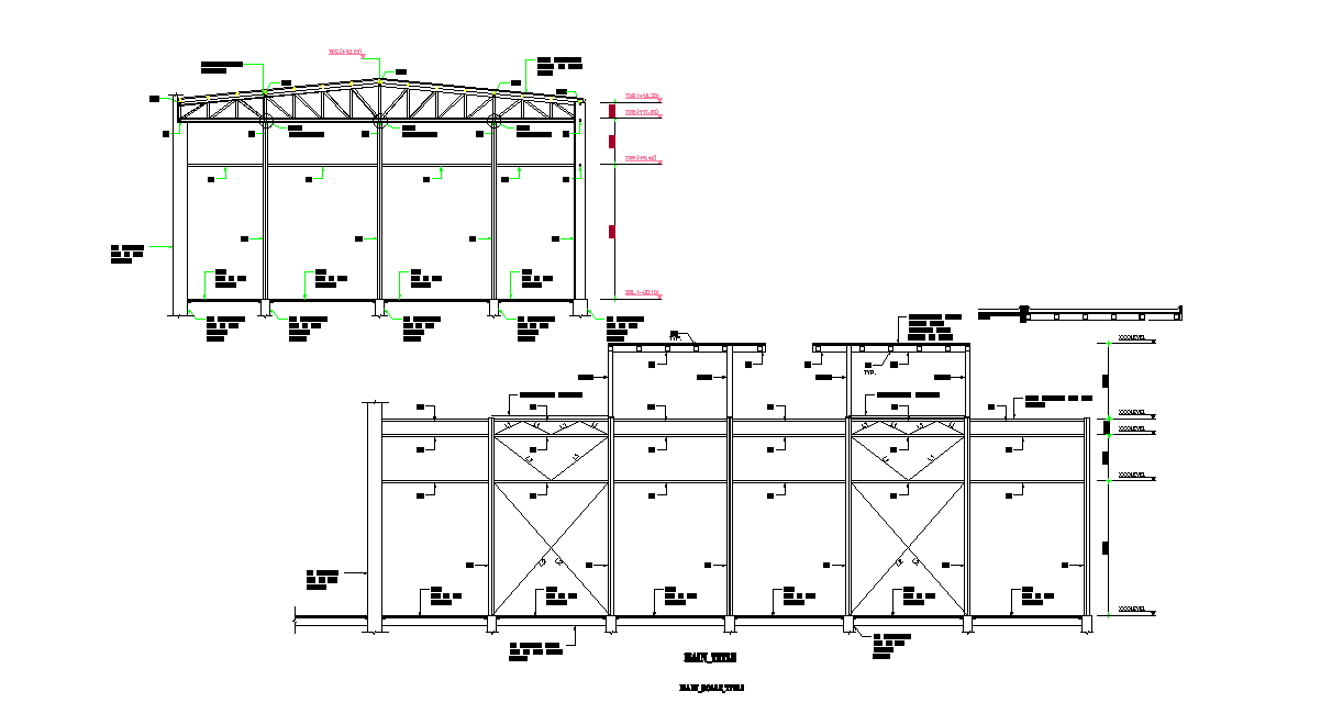 Autocad DWG file contails section and elevation of steel truss roof building.detailed explanation of steel truss structure given in the drawing. Download DWG file.