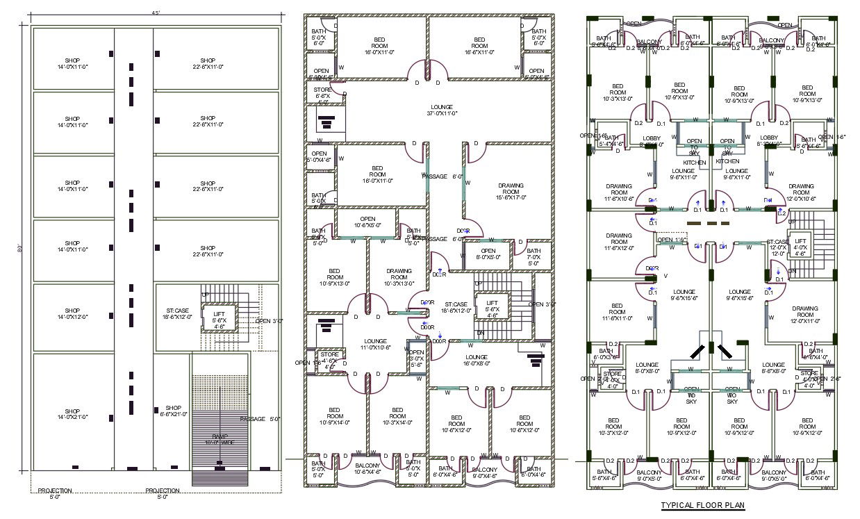 45' X 80' apartment layout plan CAD drawing that shows shop on ground floor and residence house on top floor which includes 2 BHK and 3 BHK different size house plan design. also has basement ramp parking plan, staircase, lift and all dimension detail. download luxurious apartment floor plan design DWG file.