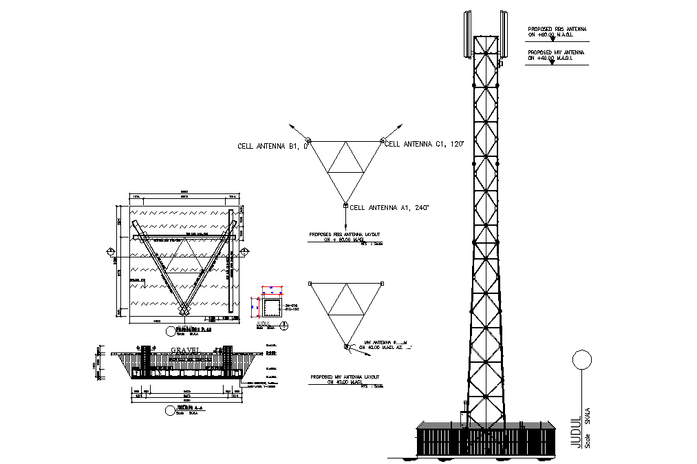 Mobile network tower foundation and Elevation details are available in this drawing file. This drawing shows the section of the foundation, gravel details, the floor plan details and the layout design of the cell antenna also mentioned in this drawing file.