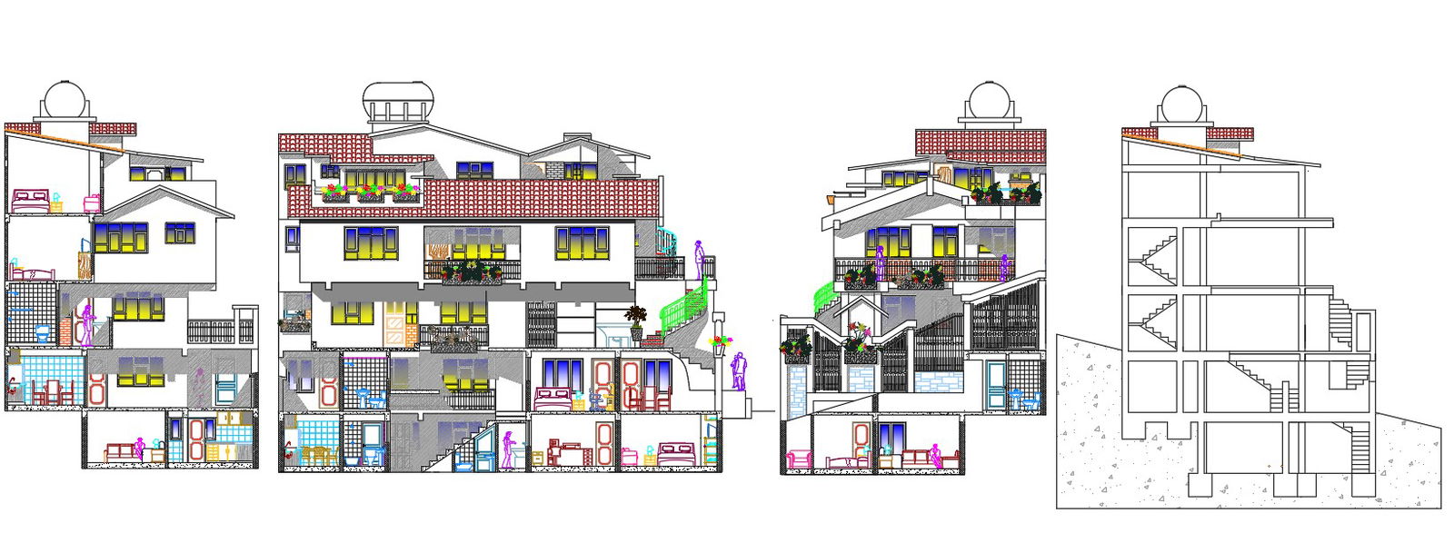 The architecture residential apartment building sectional elevation design in different angle view that shows number of floor level building structure design, cross section furniture design, door window marking and clay roof design. download beautiful apartment building design DWG file and use the miscellaneous CAD blocks for improve the CAD presentation.