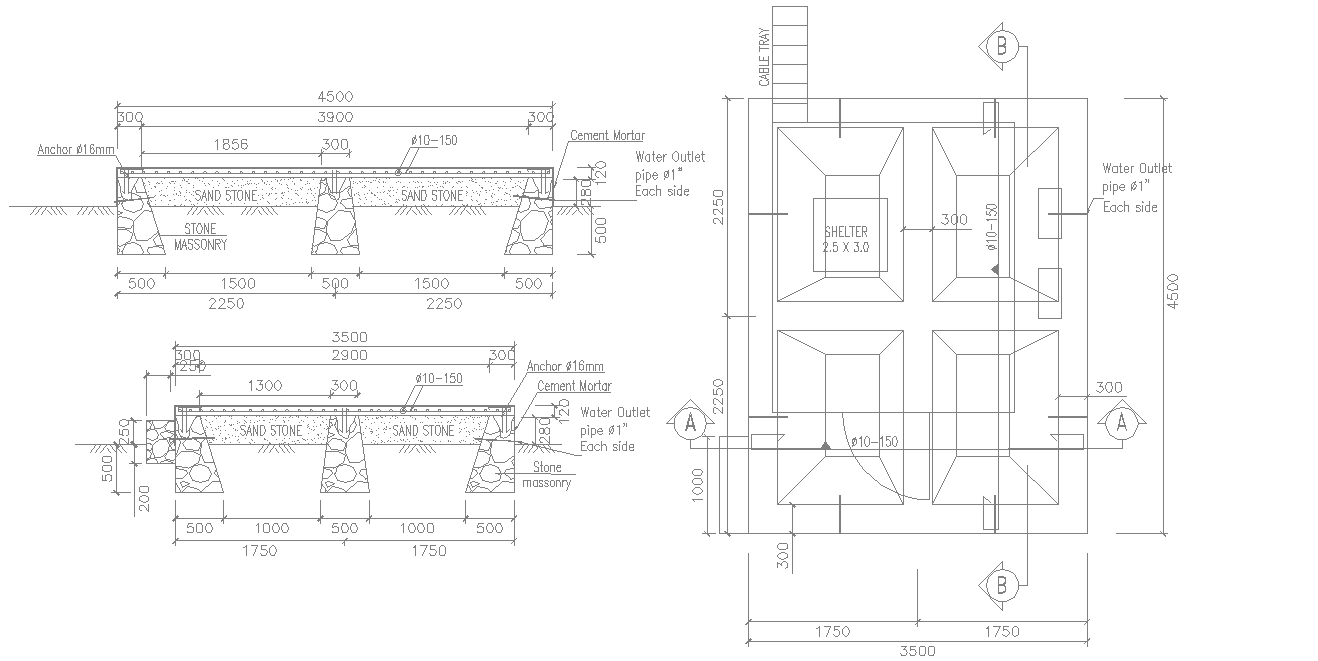 This Autocad DWG file contains the section and elevation details of 3500mm X4500mm four shelter stone masonry concrete.Two side sectional view and stone masonry foundation details are given in this drawing file, sandstone and cement mortar are placed in this foundation. Download the DWG AutoCAD file.