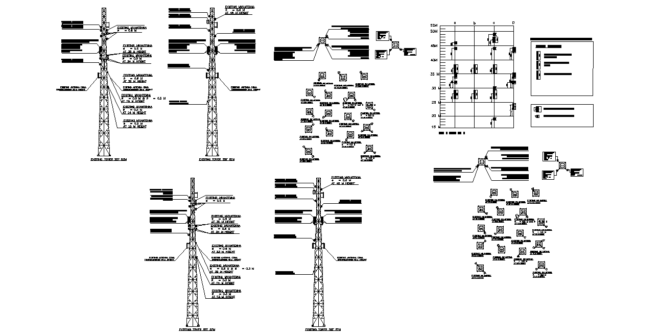 Mobile network tower Elevation design is available in this drawing file. This drawing file shows the elevation view of the telecommunication tower and the details of the antenna on the tower. total four-tower elevation available in this drawing each tower having ten types of antenna to check the details download the AutoCAD dwg file.