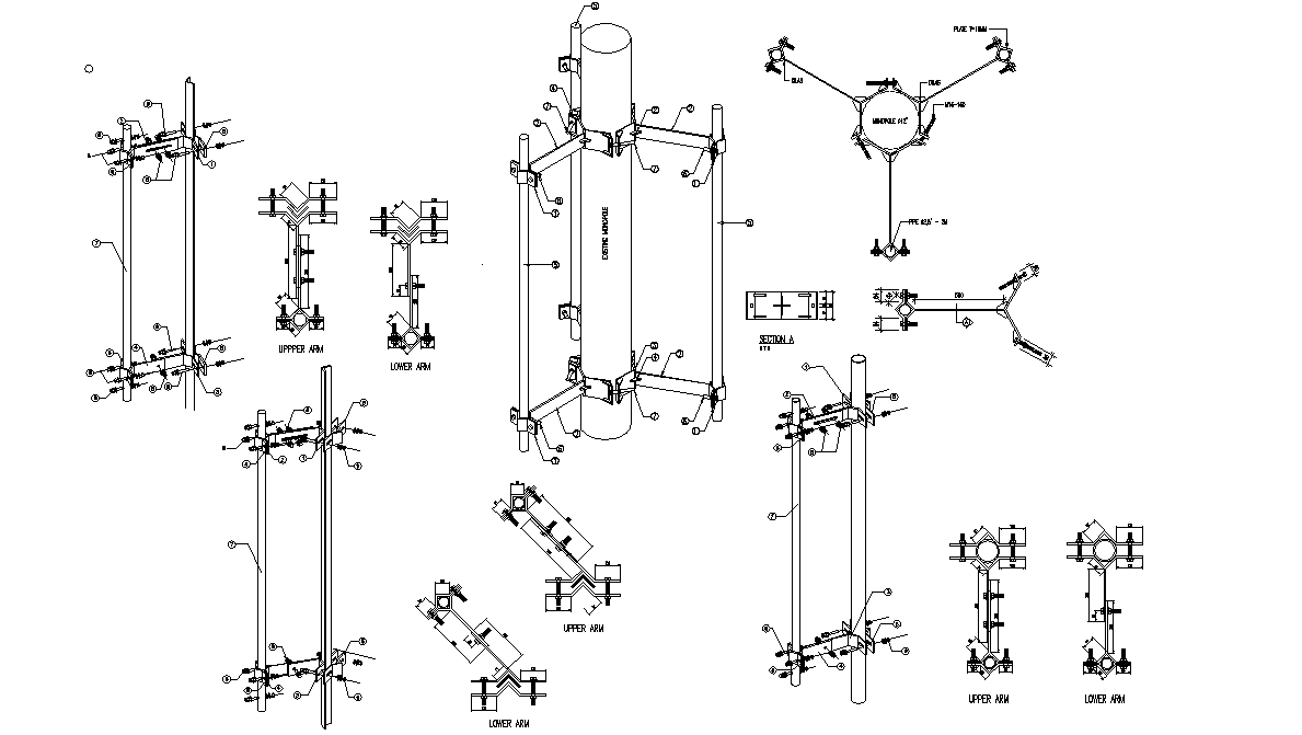 Autocad Drawing file shows the details of existing electrical pole upper arms and lower arms connection and parts details, the screws and bolts are attached in both upper and lower arms to fix on the electric pole. The top monopole view side view of the pole section is also available in this drawing. Download Autocad DWG file.