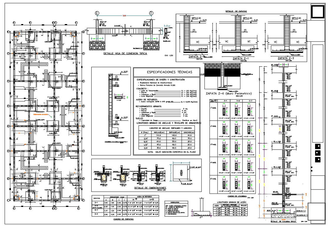 RCC construction working plan CAD drawing shows foundation plan, column supported beam, combined footing pad foundation structure that both columns carry unequal loads and number of using reinforcement. download apartment construction working plan with center plan DWG file.