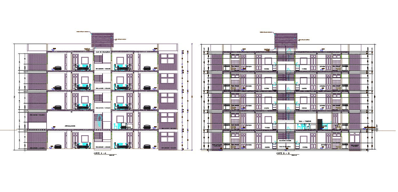 2D CAD drawing of residence apartment building section drawing that shows front and rear view with all dimension detail, cross furniture design and building structure design with dimension detail. download apartment section drawing CAD file