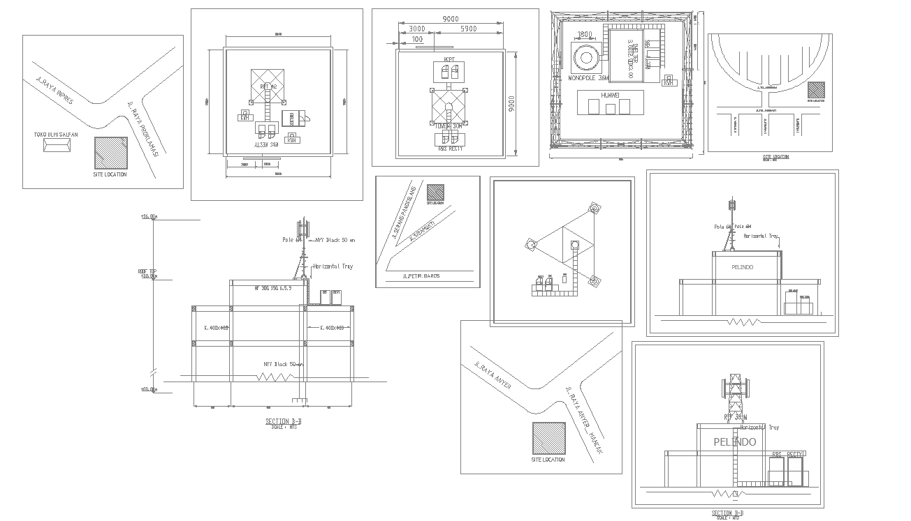 DWG file contains the details of 6m small electric pole placed on the G+2 building. Site layout plan is mentioned in this drawing.9000x9000 site area covered to place this small tower over the building. Also, fencing is covered over the electric monopole. download the AutoCAD DWG file.