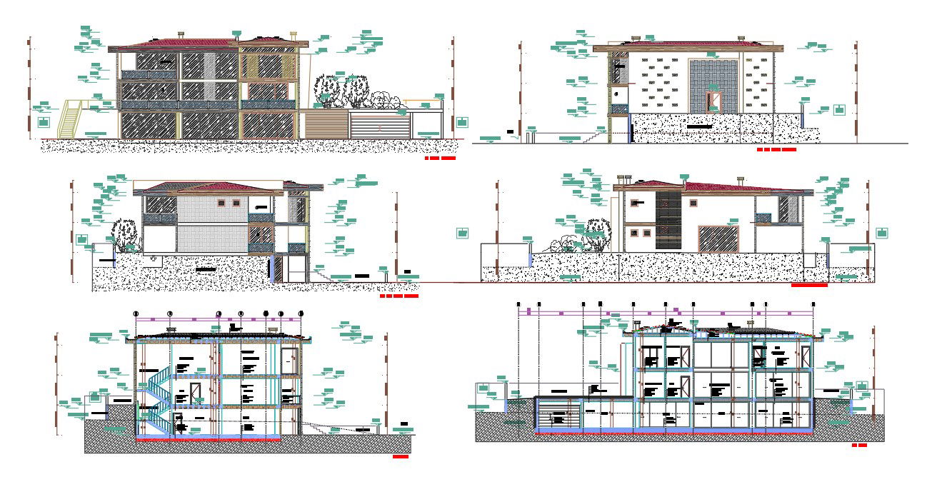 The Modern architecture bungalow house building all section drawing and elevation design which is a number of different angle view designs that shows 3 storey floor level building structure design, truss span roof and compound wall. download modern bungalow design AutoCAD and use this drawing your new project CAD presentation.