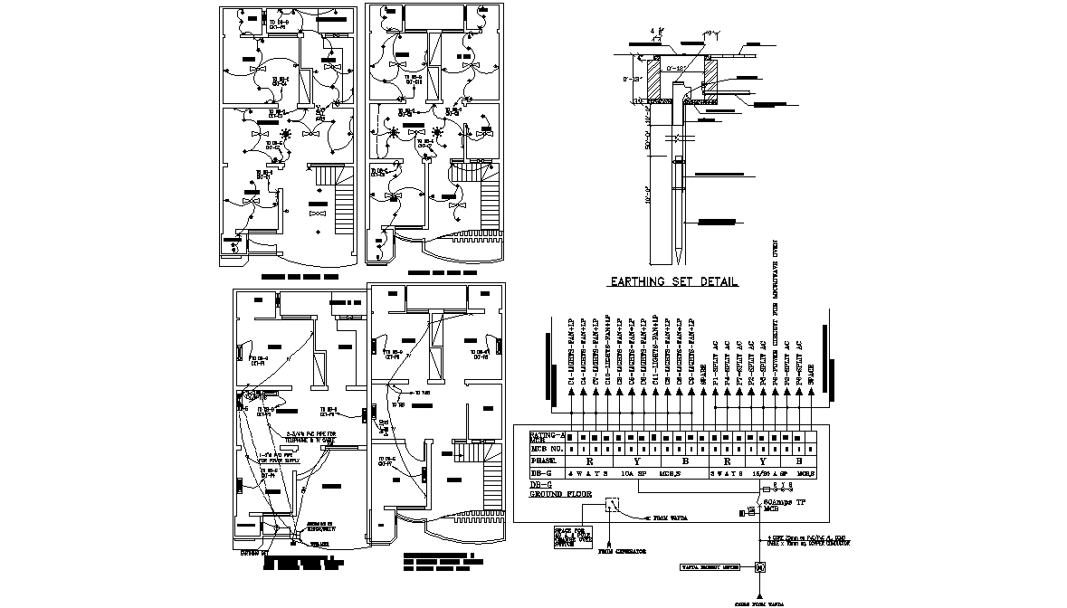 Autocad Drawing file of G+1 house, electrical connection, and light fittings detailed drawing available in this file.Power connection, earthing set connection, telephone, television, AC wiring connection detailed layout for ground and first floor of the house given in this Autocad file. Also earthing set detail and generator connection details also available. Download CAD DWG file.