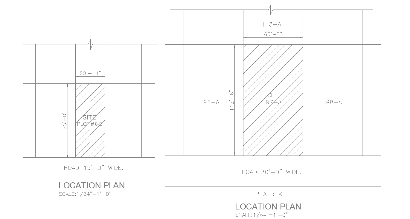 Autocad drawing file of Two site location plan. this diagram file contains two different site layout plan. One site having the land area of 29'11"X75' with 15'wide road and the other site having the land area of 60'X112'6" with 30' wide road. Download the DWG file.