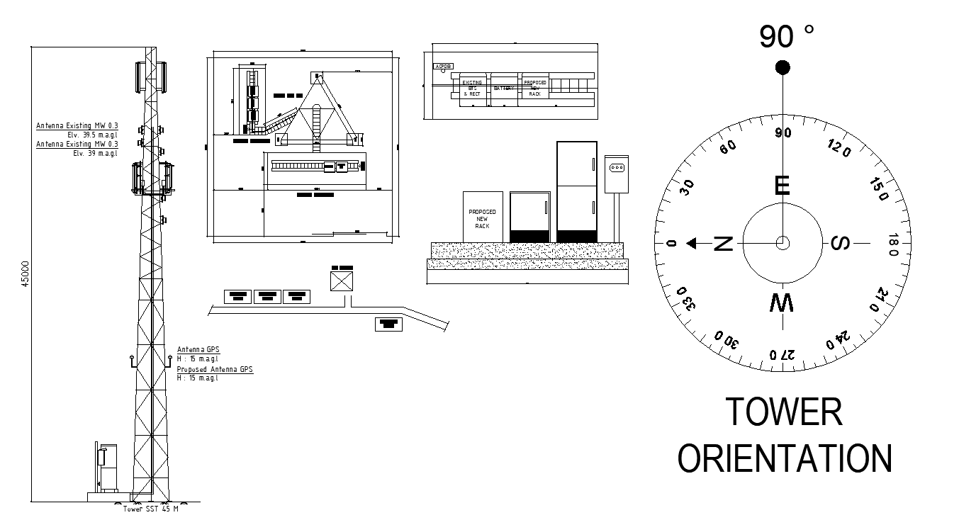 This Autocad DWG file contains the details of 45 meter height telephone tower orientation details. An existing antenna is marked in on the tower and proposed antenna GPS details available in this drawing file. proposed new rack elevation details also gave. download the drawing file.