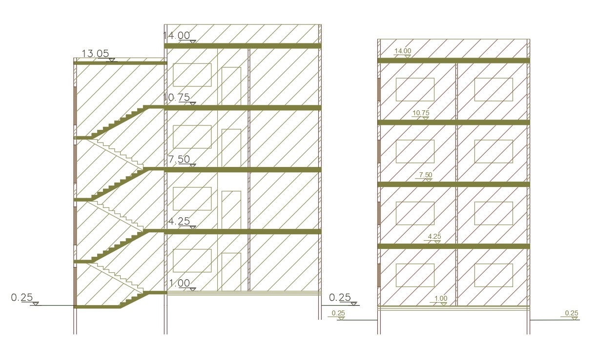 10 X 20 meter apartment building section drawing that shows front and side view includes standard staircase and RCC slab design. download 200 square meter apartment building section drawing DWG file.