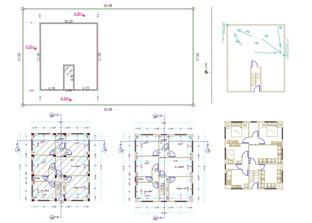 10 X 12 meter plot size of architecture house ground floor and first floor plan with furniture layout plan design which includes 3 bedrooms, drawing room, living room and kitchen with all dimension detail. download 120 square meter house plan with site plot plan design DWG file.