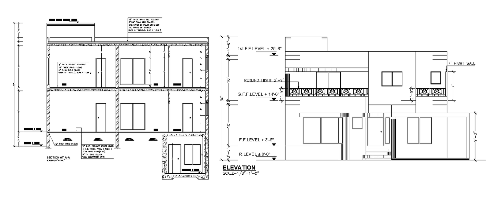 Drawing file of the Section and Elevation details of G+1 House. In the section plan the details of the floor finish, tile flooring, sand filling, concrete filling, one layer of polythene sheet, Thickness of the slab and height of the floor from the ground level are given. Also, the elevation design of the house is given. Download the DWG file.
