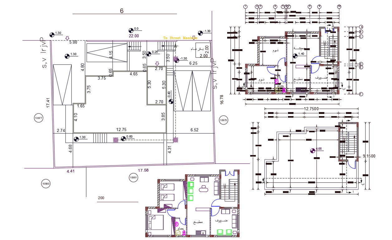 14 X 9 meter architecture house ground floor and first floor plan with column layout center line plan and dimension detail. download 2 BHK house furniture plan with 4 car parking accommodate design AutoCAD file.