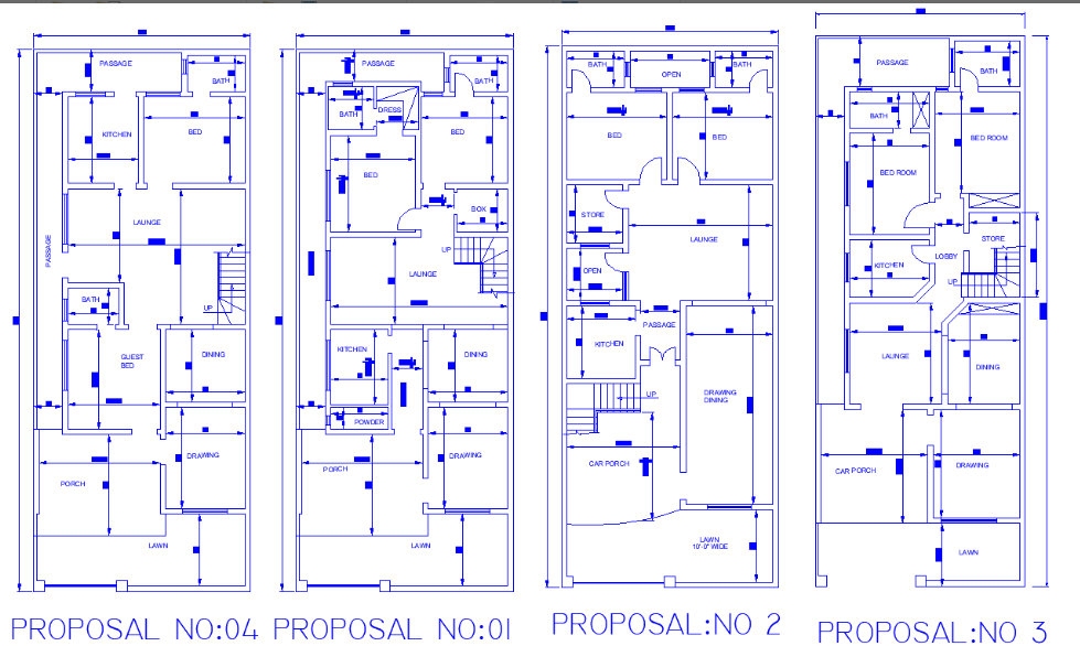 30'X75' Four different ideas of 2BHK House plan AutoCAD DWG file. In all four plan building area is same, room allocation and room sizes vary in all four house plans. In all plans master bedroom with attached toilet, Children's bedroom with attached toilet,Drawing room, Kitchen , Dining, Lounge, porch, and Lawn are available. Download the AutoCAD Drawing file.