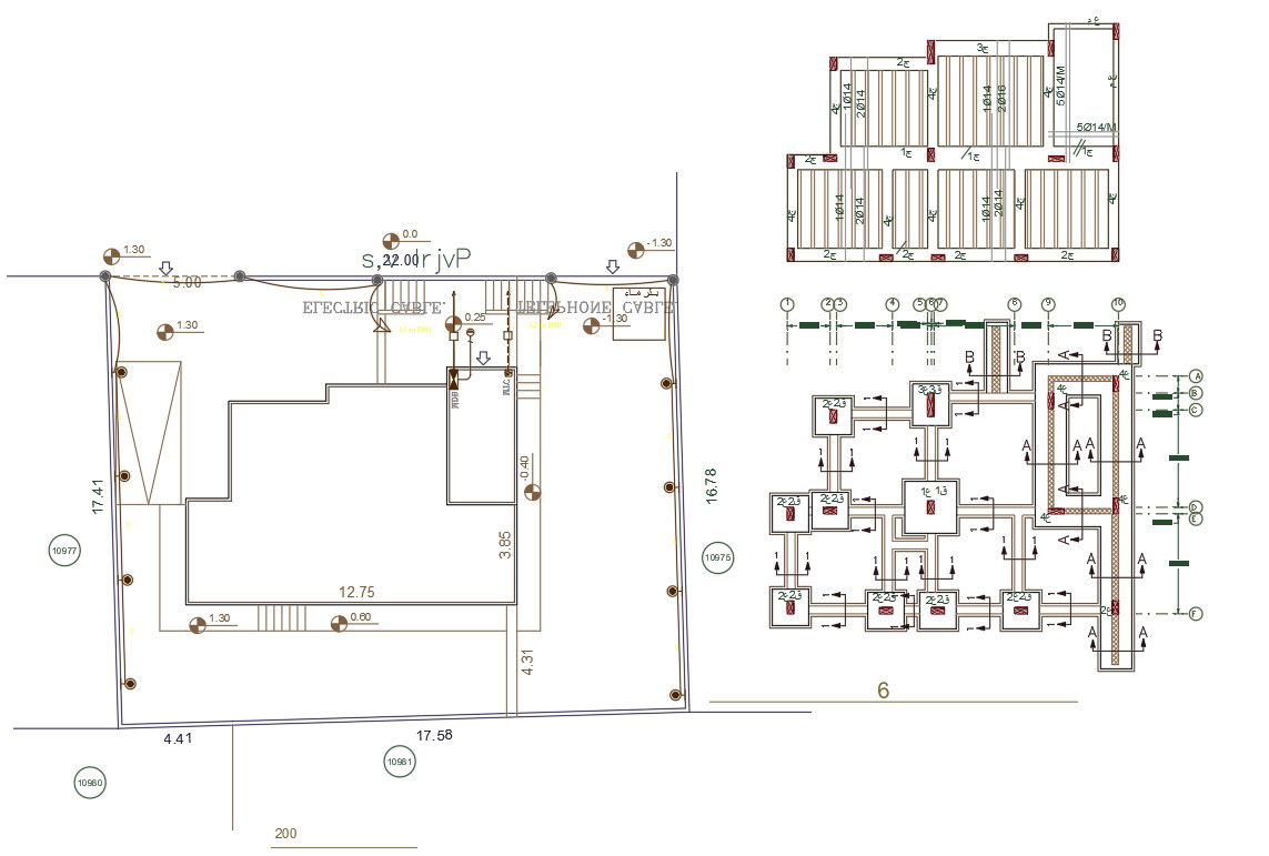 AutoCAD drawing of RCC construction working plan design that shows foundation plan, excavation plan and slab bar structure design with center line detail. download house site plan with center line plan design.