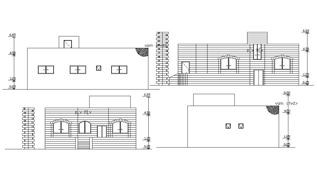 The architecture drawing elevation layout provide plinth level 0.25 meter, floor level, height 6.80, window details, door details, hatching, overhead water tanks, etc. download CAD file.