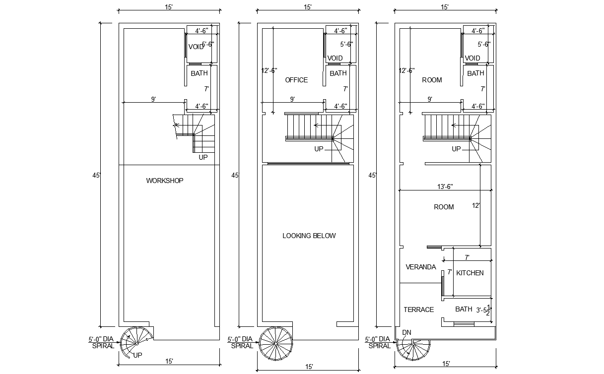 15'X45' single BHK G+2 House plan AutoCAD DWG file.Download the file.