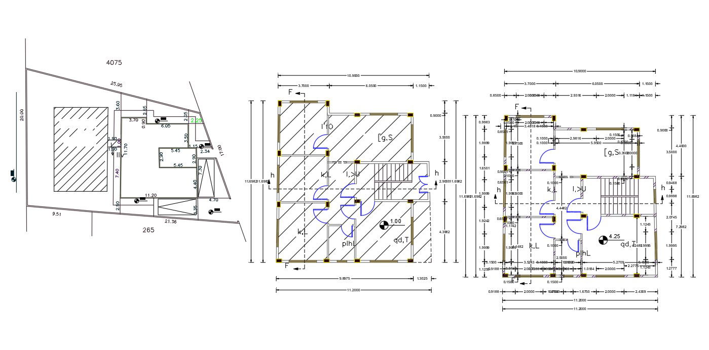 AutoCAD drawing of residence house ground floor and first floor plan with dimension detail that shows 2 bedrooms, kitchen, drawing room and living area. download housed floor plan and master plan design with plot land detail DWG file.