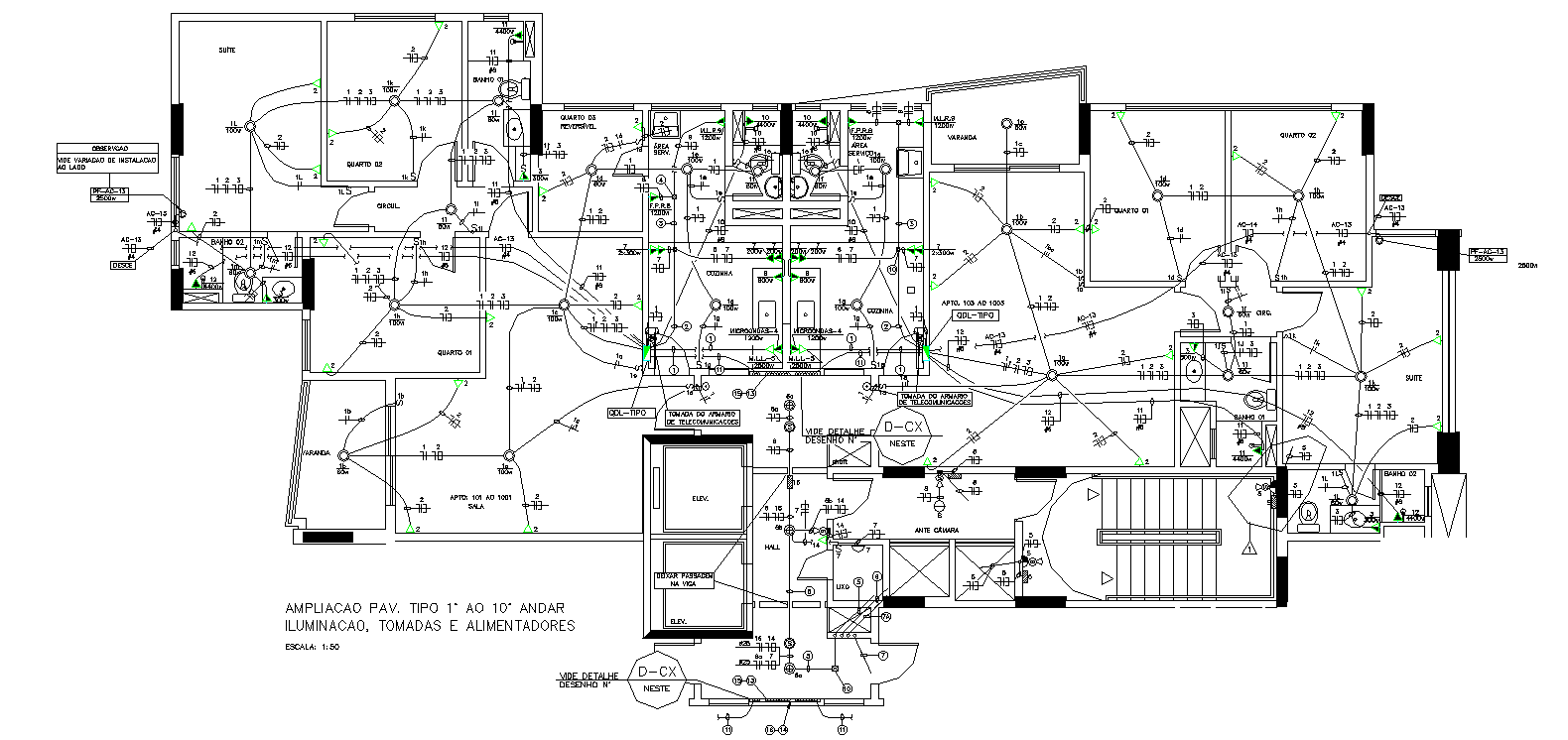 Electrical Layout drawing of Four-bedroom Luxury Ground floor House plan AutoCAD DWG file. In this plan master bedroom with attached toilet, kid's bedroom with attached toilet, Guest with attached toilet, bedroom with attached toilet, Drawing room, Kitchen, Dining, TV Lounge, porch, and Lawn are available. The Staircase is placed inside of the house. Electrical connection details are given in this AutoCAD DWG file. Download the AutoCAD Drawing file.