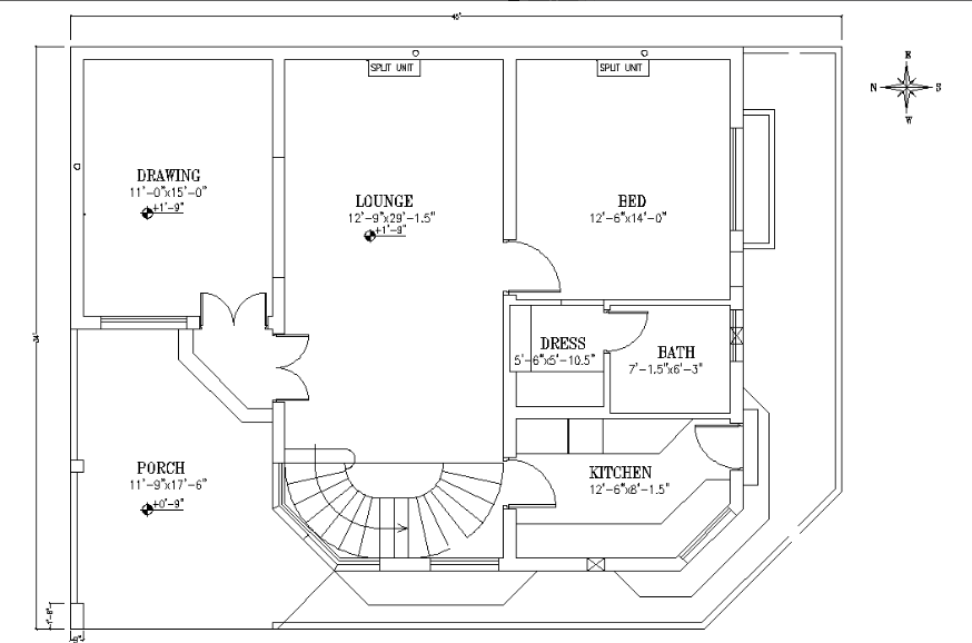 Ground floor single story house plan of the sizes 45'X34'.In this house plans one Master bedroom with the attached toilet, Lounge, Lawn, common toilet, porch, Drawing room, Kitchen is available. The Staircase is available inside of the house. Download Autocad DWG file.