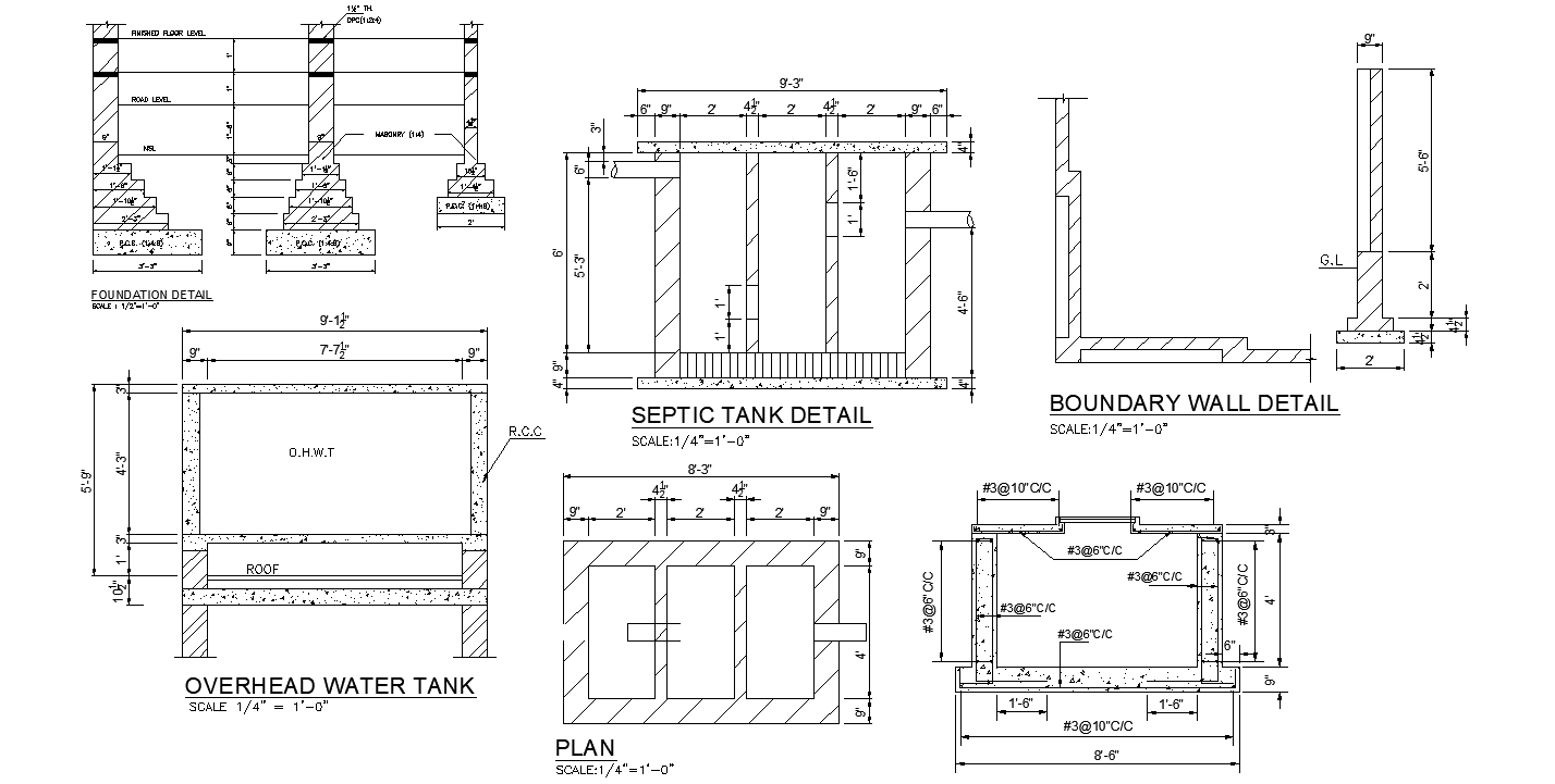 Autocad drawing file shows the Sectional Details of the septic tank, Boundary wall,U.G water tank, Foundation, overhead water tank and ramp.Download the file.