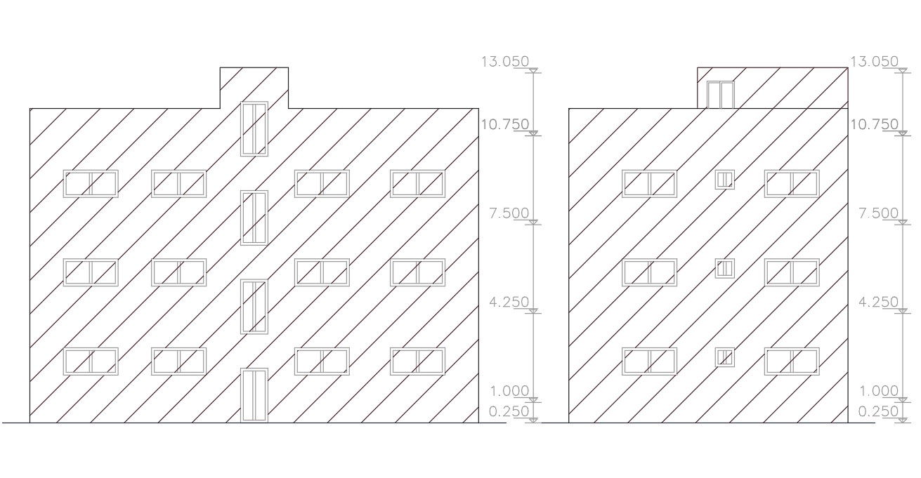 160 square meter apartment building front and side view elevation design that shows 3 storey floor level building structure design, door window marking and measurement detail 13 meter height of apartment building DWG file.