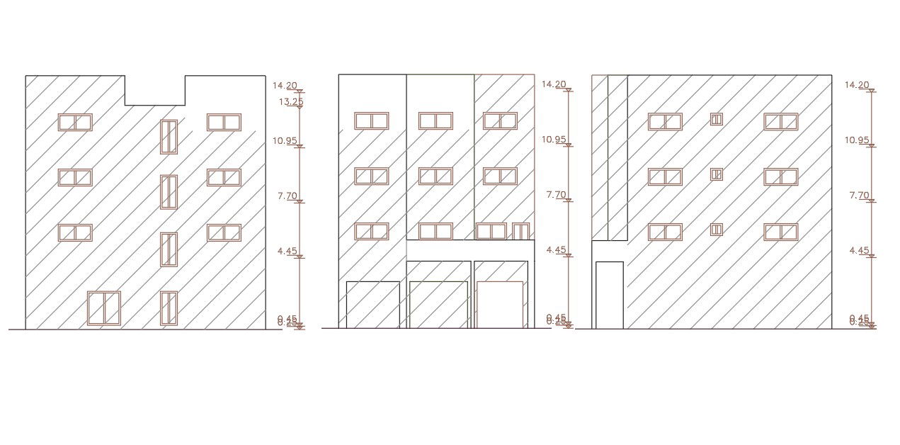 AutoCAD apartment building elevation design that shows 3 BHK house with retail shop on ground floor design with dimension detail. download 150 square meter apartment building design DWG file.