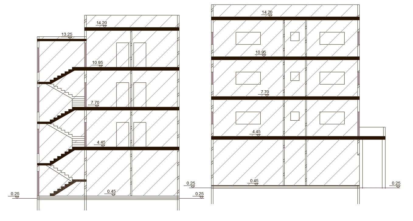 2D CAD drawing of 2 BHK apartment building front view and side view section drawing that shows standard staircase and RCC slab design. download apartment building section drawing DWG file.