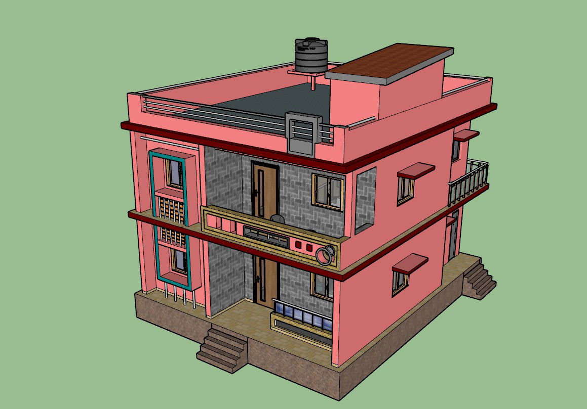 Download free 3d model of modern house building isometric elevation design sketch up file that shows 2 storey floor level building design.