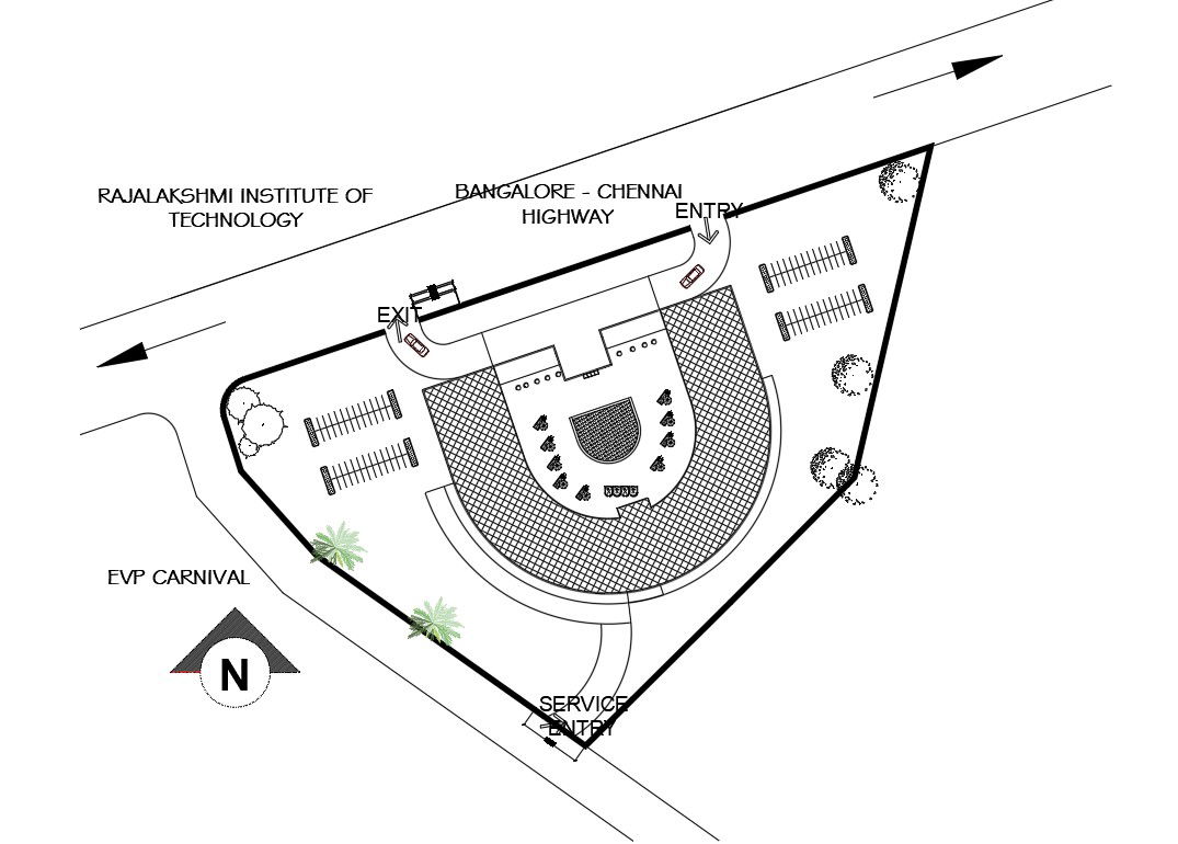 Download free CAD drawing of north facing hotel master site plan design which includes build up area, entrance way, high way road, parking lot and compound wall design with service entry detail.