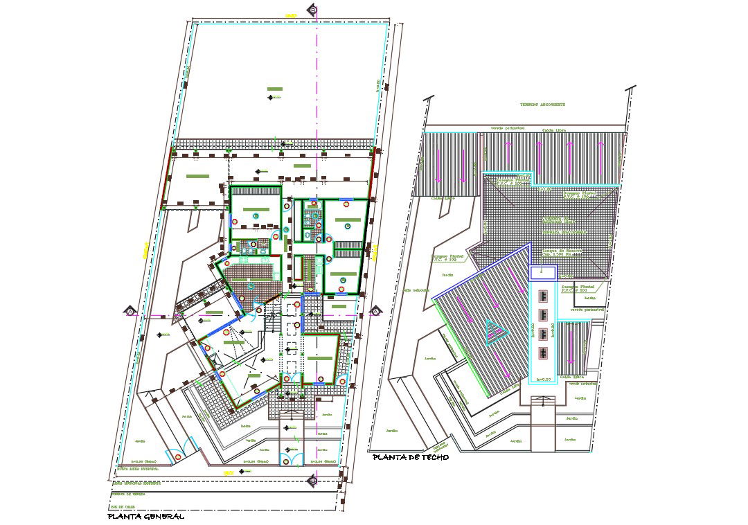 The house project master plan design and top view roof plan design CAD drawing that shows build up area and compound wall design with 3 bedroom layout plan design. download house master plan and top view roof plan design DWG file.