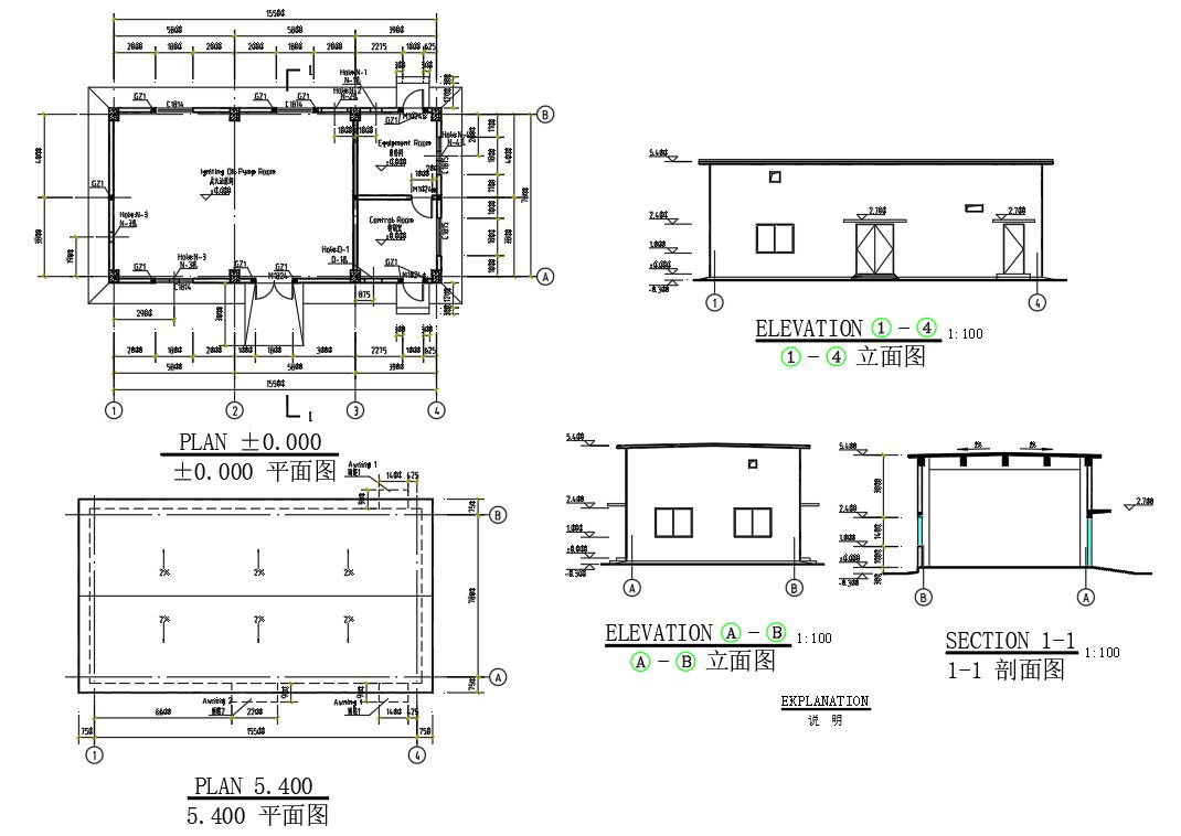 Floor plans, section and elevation details of ignition oil pump house. On the floor plan the details of the Ignition oil pump room, equipment room, control room dimension are mentioned. Also, front and side elevation and section drawings are given in this DWG file. Download the AutoCAD DWG file.