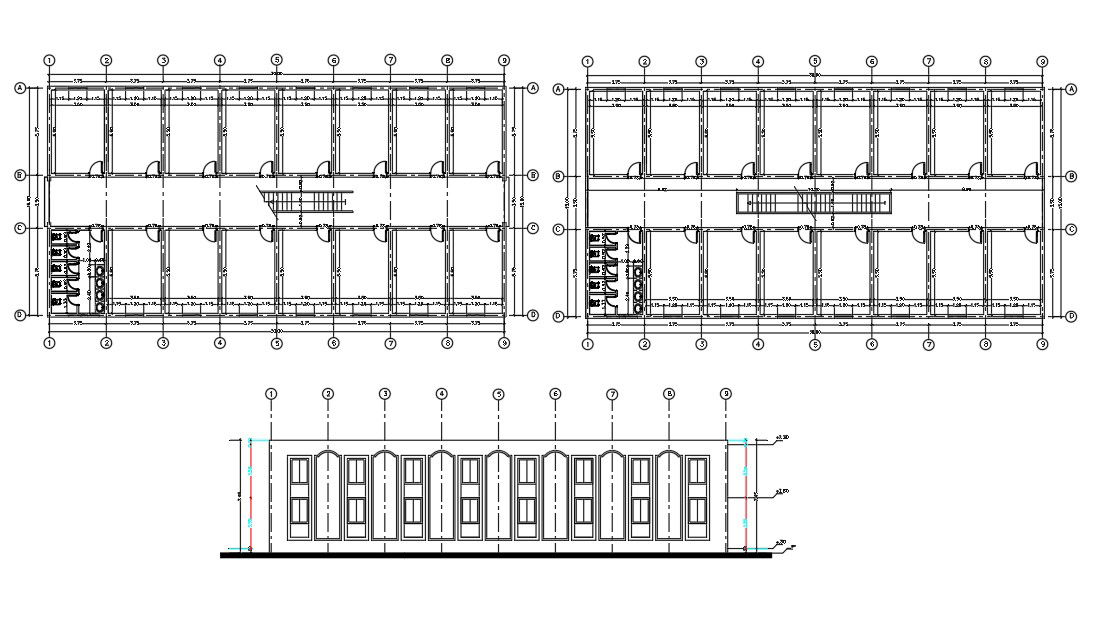 Autocad Drawing file shows30X15 m Shopping complex floor plan and elevation design. There are 15 shops in that complex. And the staircase is available to the center of the Building.elevation of this shopping complex is available. Download Autocad DWG file.