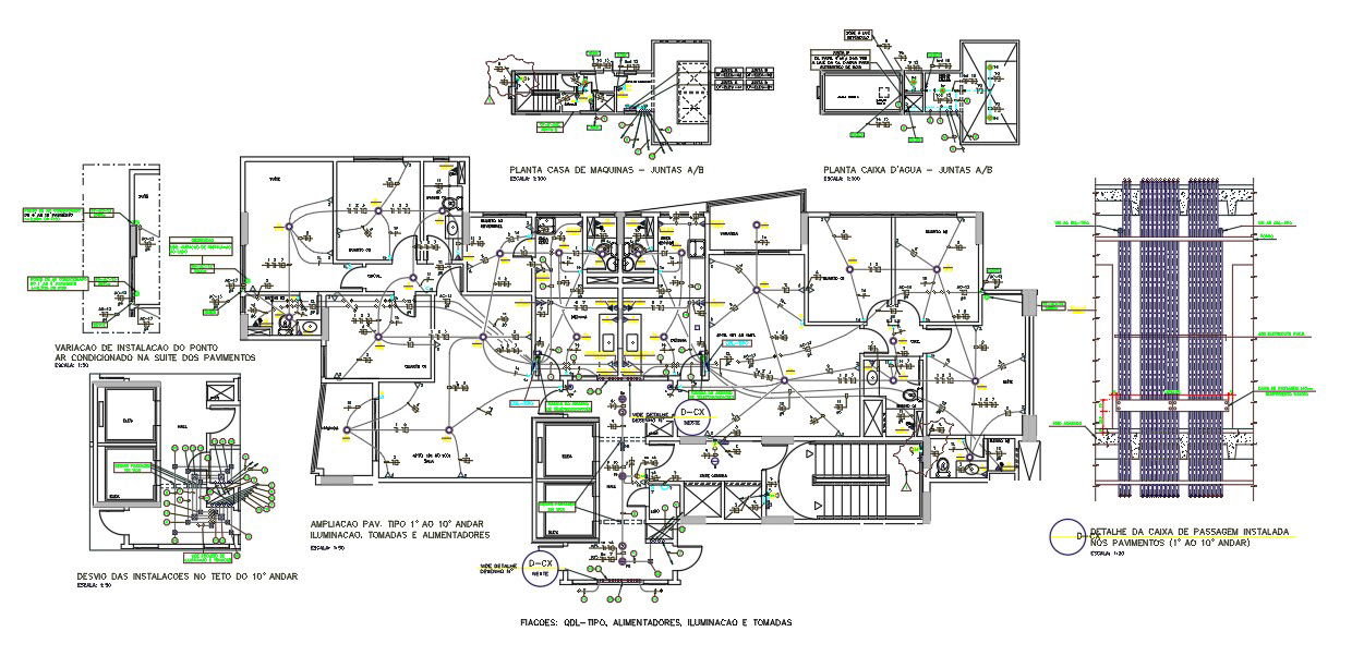 Electrical drawing of three-bedroom luxury and spacious House plan AutoCAD DWG file. In this house plan, the master bedroom with attached toilet, kid's bedroom with attached toilet, Guest with attached toilet, bedroom with attached toilet, Drawing room, Kitchen, Dining, TV Lounge, porch, and Lawn are available. The Staircase is placed inside and center of the house. The electrical drawing of this house is available in this drawing file. Download the AutoCAD Drawing file.