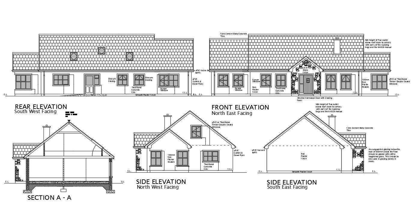 Autocad drawing file shows the detailed plan of the single storey small house plan with front, rear, north and south side elevation and section plan is available. Download the file.