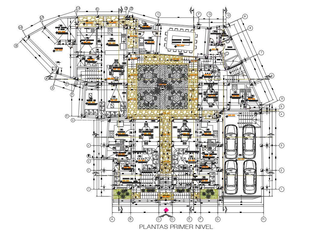 The architecture double height house ground floor plan with center line design that shows furniture design and dimension detail that shows landscaping design and parking lot. download 4 unit house ground floor plan design DWG file.