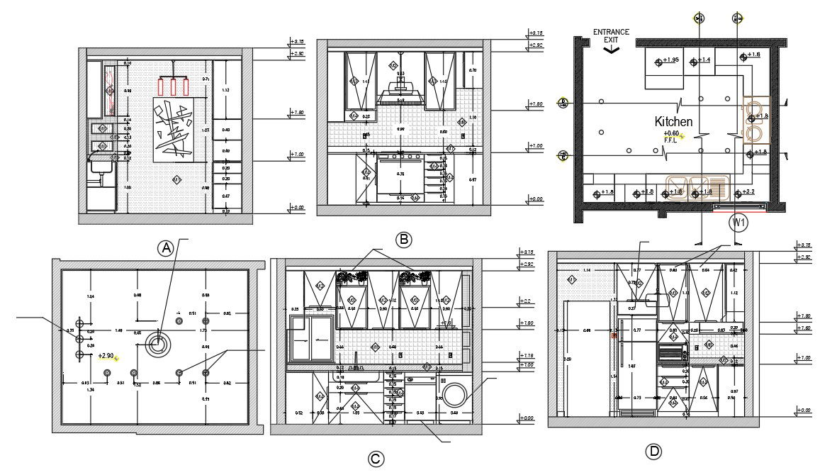 The Autocad DWG file shows Work Drawing of making Modular Kitchen, Rack division details, kitchen window size, Chimney placement distance, dishwasher, Gas stove, micro oven measurement of cutlery racks are given in this drawing file. Download the DWG file.