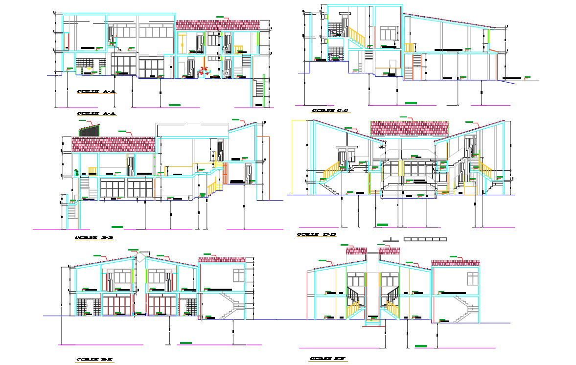 The residence house 4 init building four side section drawing that shows ground floor parking area, first and second floor residence house design also has cross furniture section drawing. download 2 storey house building section section drawing DWG file.