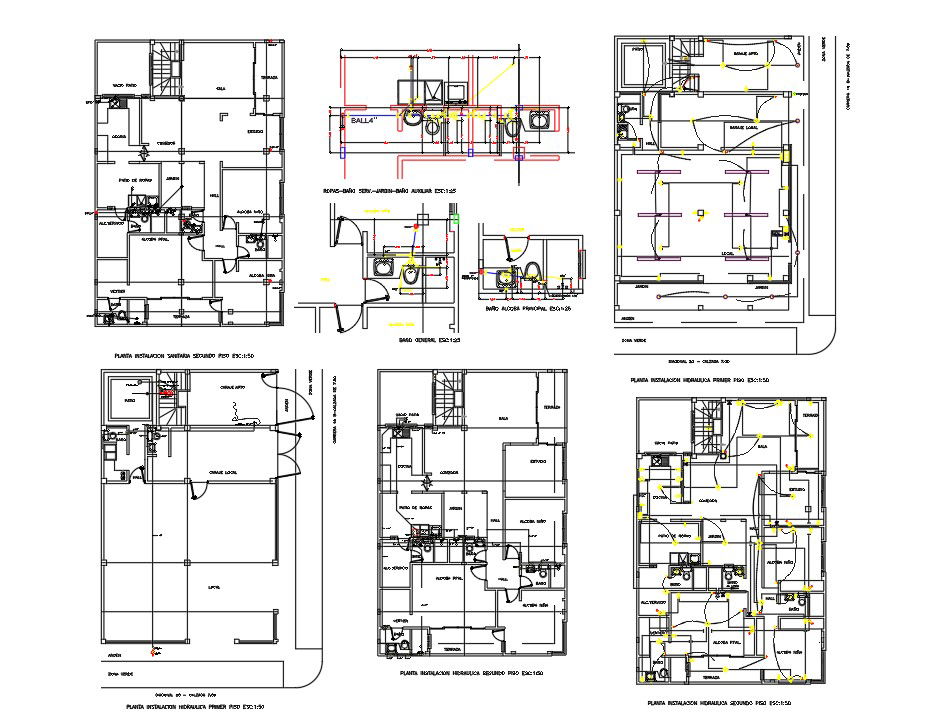 AutoCAD drawing of residence house 2 storey floor level layout plan design with dimension detail. also has plumbing and electrical layout plan design with ceiling light point and dimension detail. download house plan with sanitary ware detail DWG file.