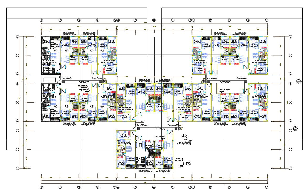 The apartment cluster layout plan with center line plan and bedrooms house furniture design which shows the building plan, thickness of walls, clear spaces inside the building and column locations with dimension detail. download architecture modern apartment house plan design AutoCAD file.