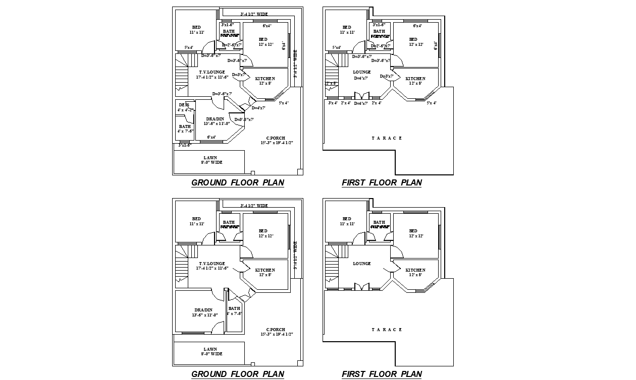 35'X45' G+1 two-bedroom house plan AutoCAD DWG file. In this Plan the Ground floor having a master bedroom with an attached toilet, Children's bedroom, Drawing room, Kitchen, Dining, TV Lounge, lobby, porch, and Lawn are available. On the First floor room, a master bedroom with an attached toilet, Drawing room, Kitchen, Dining, TV Lounge, lobby, porch, and Lawn are available. Download the AutoCAD Drawing file.