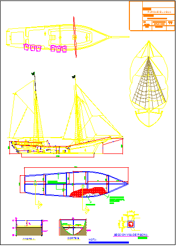 This is a detail drawing of Ship.In this drawing Plan,Elevation ,Section, Top view, Side view and all detail of ship which is available in this file.