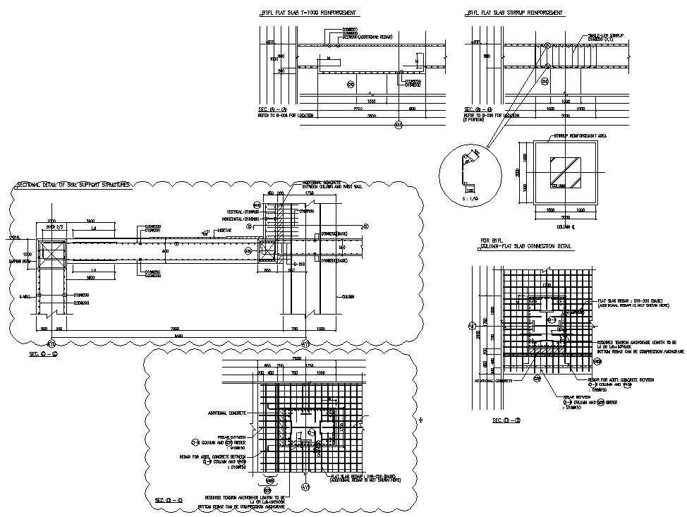 Autocad drawing file contains the sectional details of soil support structure,,Flat slab RC detail,flat slab stirrup reinforcement,Download the DWG file.