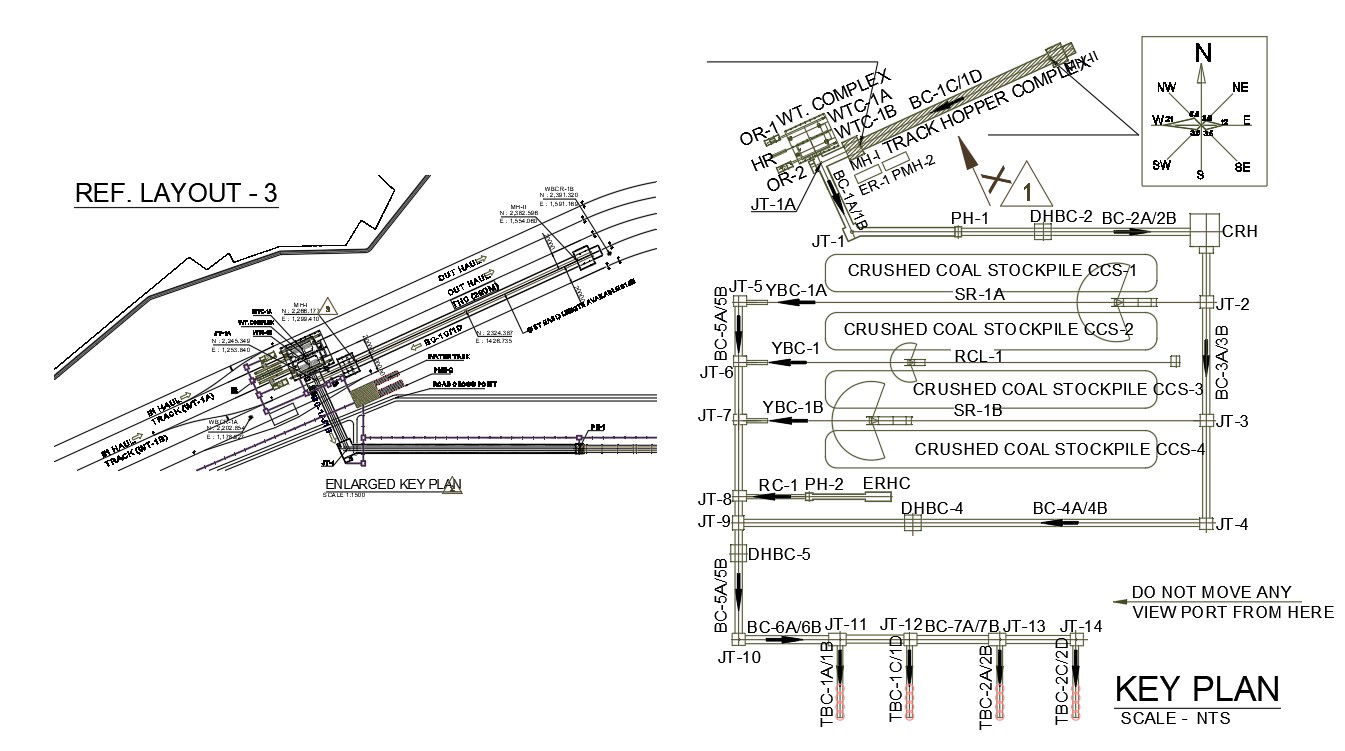 2d CAD drawing of coal crushed plant with key plan and layout design with direction symbol also coal and crushed limestone stockpiles for use in iron ore smelting (CHPP) coal handling and preparation plant DWG file.