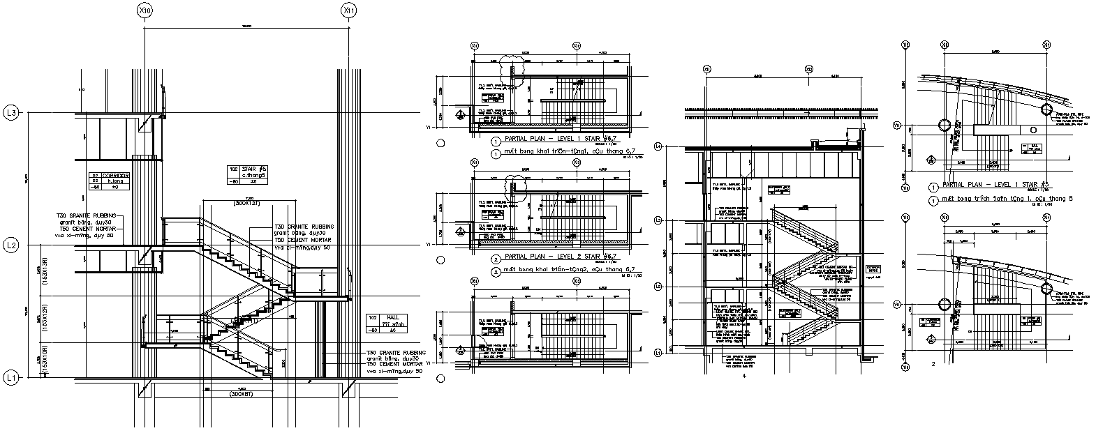 AutoCAD drawing files show the detail of Side Elevation and Level 1 and 2 partial plan of Staircase 2d drawings. Download the AutoCAD DWG file.